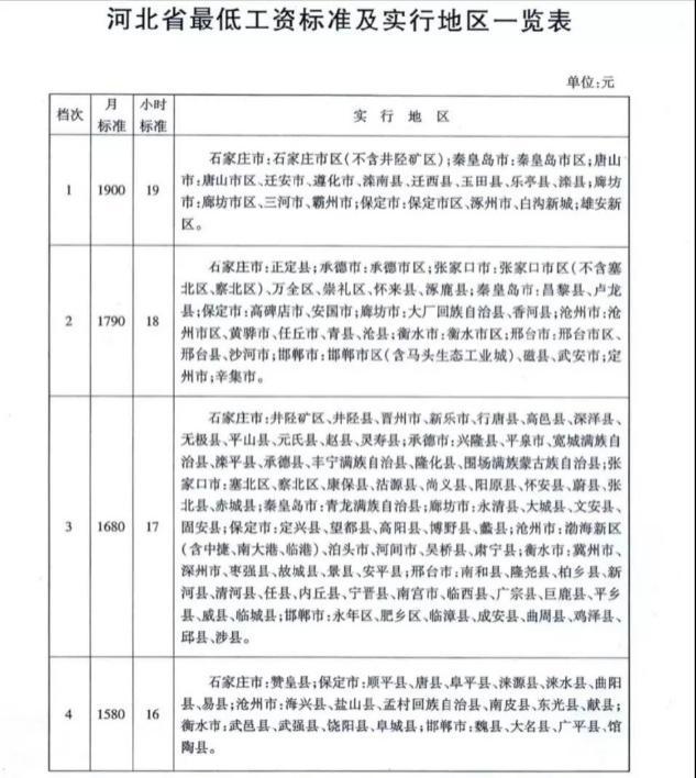 9月20日,河北省人社厅发布《关于调整河北省较低工资标准的通知》。通知称,2019年11月1日起,河北省调整全日制就业劳动者月较低工资标准和非全日制就业劳动者小时较低工资标准。