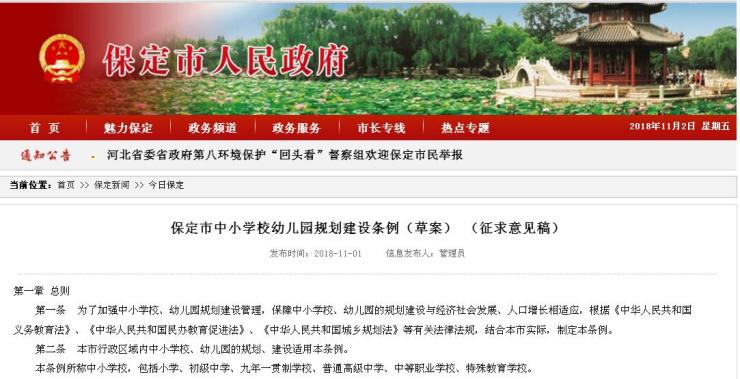 搜狐焦点楼市快讯,2018年11月1日,保定市人民政府网发布了《保定市中小学校幼儿园规划建设条例(草案) (征求意见稿)》。