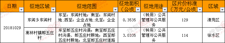 搜狐焦点楼市快讯,2018年10月29日,保定市国土资源局对清苑区东闾村村和徐水区高林村镇郎五庄村共2宗地块进行转用,开发用途均为公共管理与公共服务用地。转用总面积为3.387公顷,约合50.805亩。