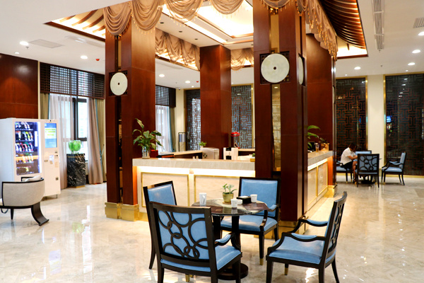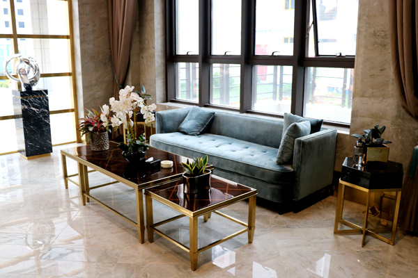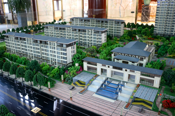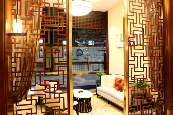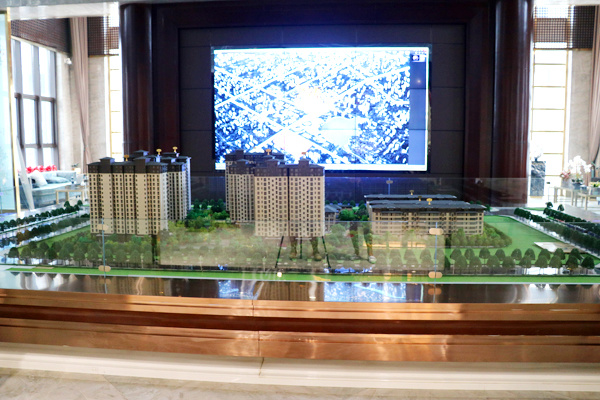 府上小区会所,共分为三层。楼体外观与小区楼座同为新亚洲主义风格建筑,恢宏大气。阶梯式的流水景观,葱郁的绿植,又透露着点点的精致。步入会所一楼的接待中心,处处明亮洁净,现代与古典极度融合的室内装潢,美观雅致。巨大的沙盘向人们展示着整体的小区,沙盘南面的大屏幕播放的宣传片让大家对项目更加了解,东西两边的户型模型详细介绍着房间信息。午后阳光透过窗,散落在屋内的沙发和木椅圆桌上。方形吧台上有各种茶水饮品,热情的工作人员为到来的客户提供着最贴心的服务。