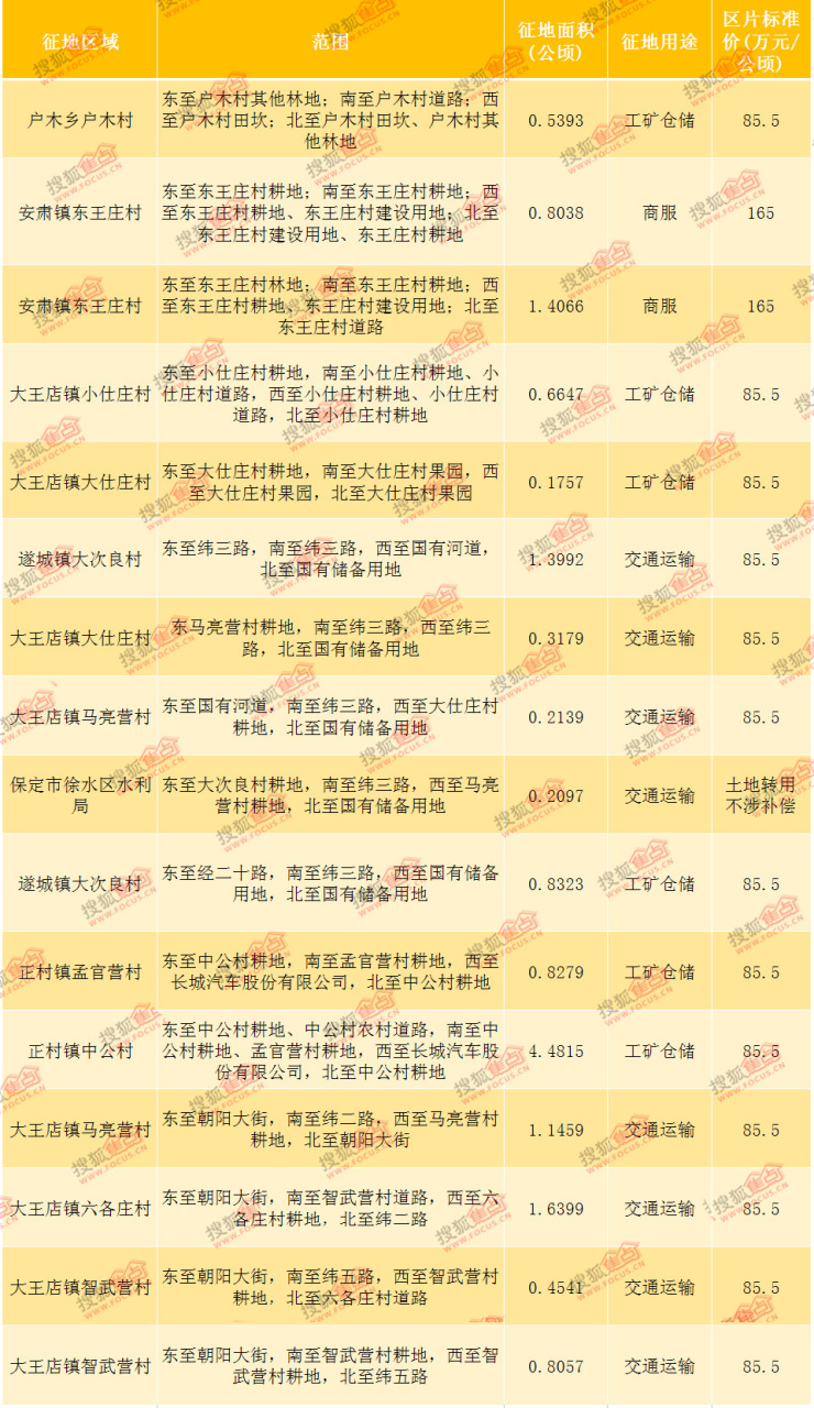 公告显示,徐水区户木乡户木村;安肃镇东王庄村;大王店镇小仕庄村、大仕庄村、马亮营村、六各庄村、镇智武营村;遂城镇大次良村;正村镇孟官营村、中公村等9个行政村,以及保定市徐水区水利局共征用、转用土地15.9181公顷,合238.7715亩。征地用途含商服、工矿仓储、交通运输。【征地详情 见下图】