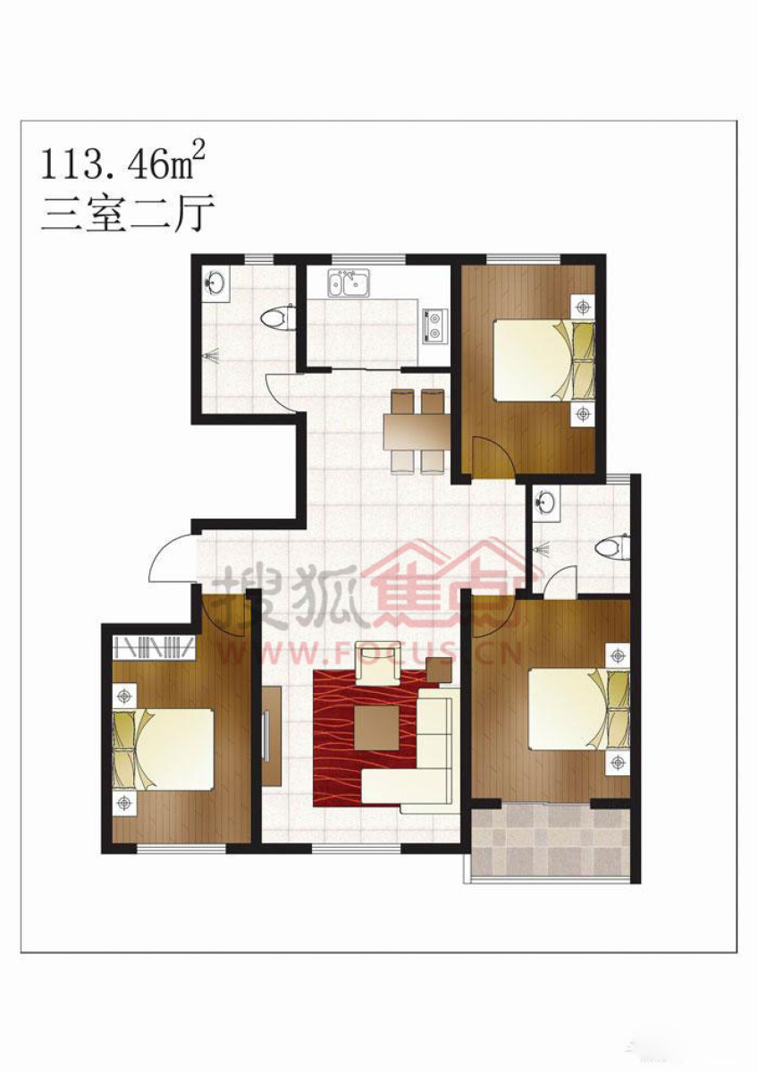 晨巍佳欣三室两厅两卫100.38平米-3室2厅2卫-113.46㎡