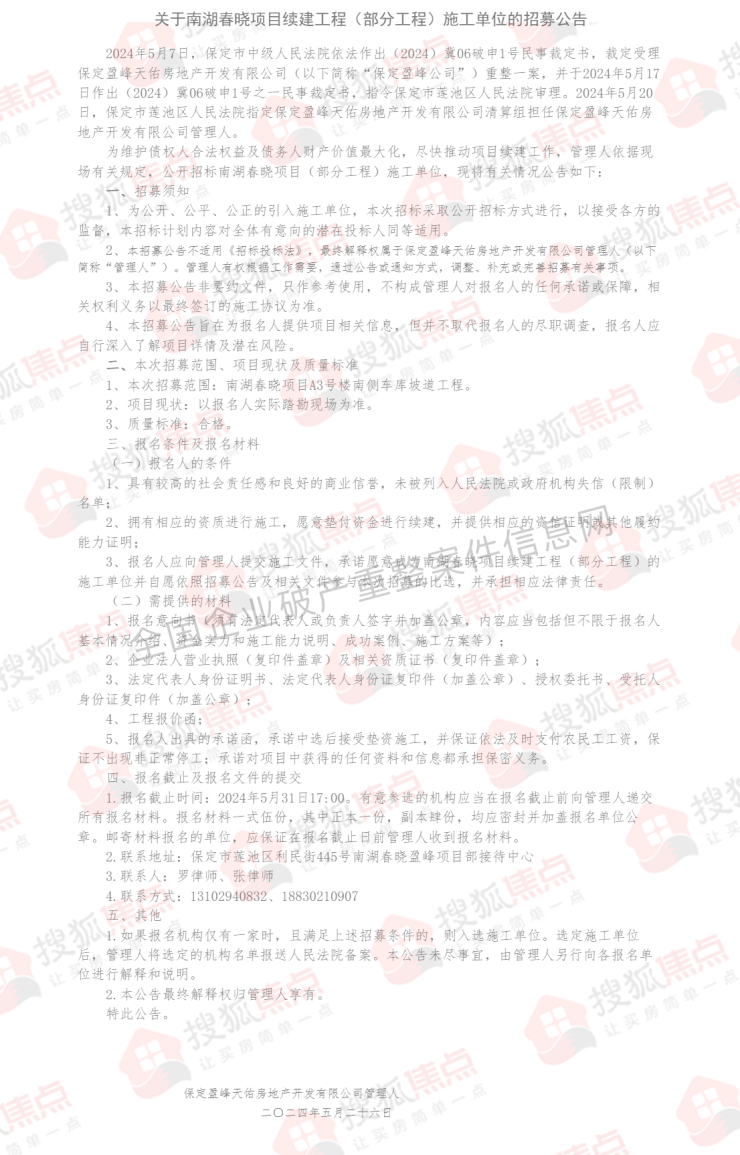 保定南湖春晓项目发布续建工程施工单位招募公告