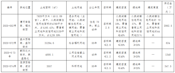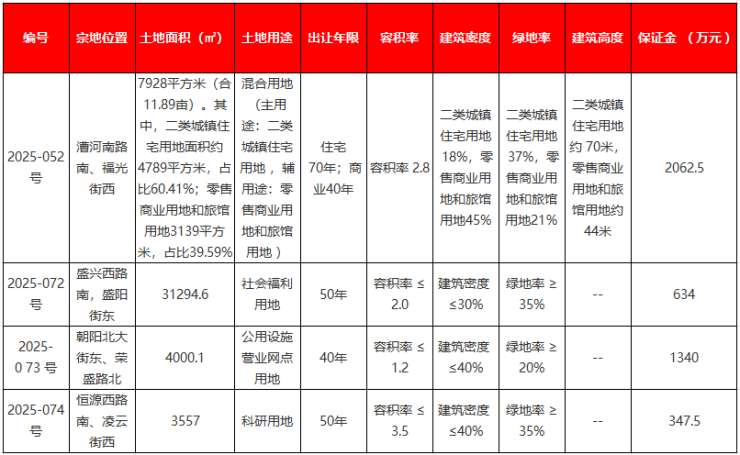 2025-052号地位于漕河南路南、福光街西,土地面积7928平方米(合11.89亩)。其中,二类城镇住宅用地面积约4789平方米,占比60.41%;零售商业用地和旅馆用地3139平方米,占比39.59%。土地用途为混合用地(主用途:二类城镇住宅用地 ,辅用途:零售商业用地和旅馆用地 ),容积率为2.8,起始价4125万元。该地块在9月2日的拍卖中未成功出让。