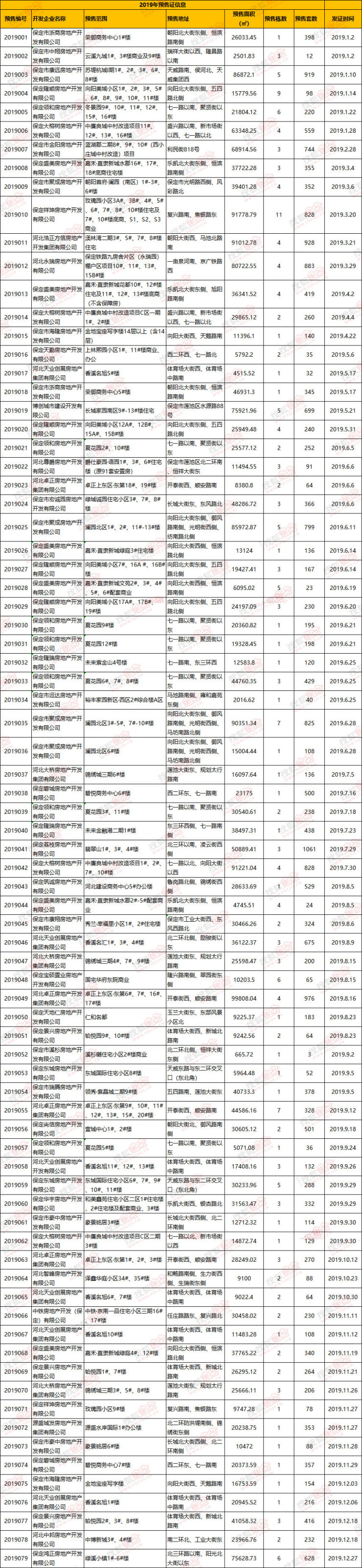 ▼ 2019年保定主城区新增商品房预售许可证审批列表