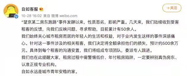 自如回应望京二房东“跑路”事件:全额承担客户损失500余万元