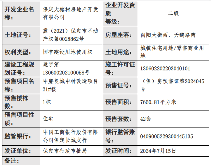 2024年7月15日,保定市行政审批局公布了一则商品房预售许可证下发公告,玉兰九赋(中廉良城中村改造)项目21#楼商品房获预售许可,共1栋楼楼。商品房预售证号为(保)房预售证第2024045号,预售面积7660.81平方米,预售套数42套。