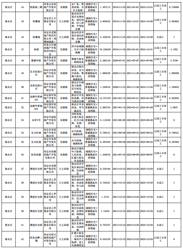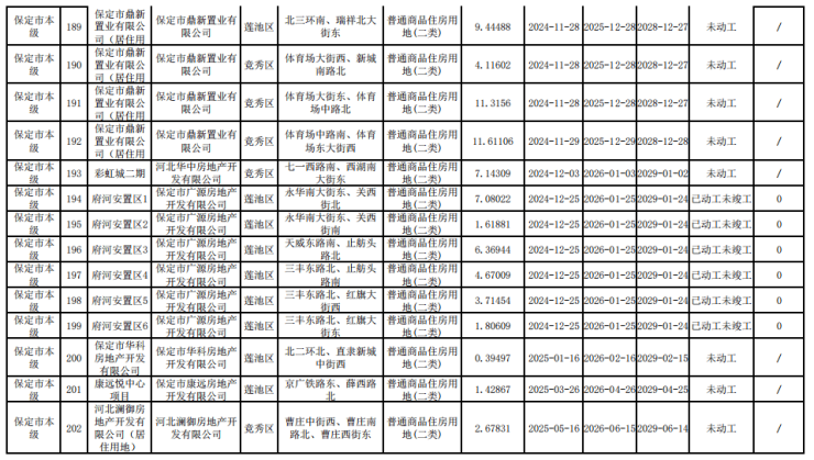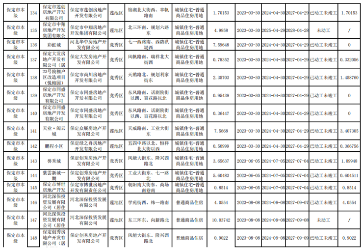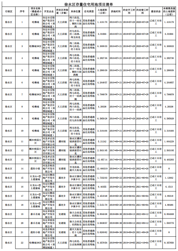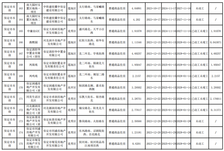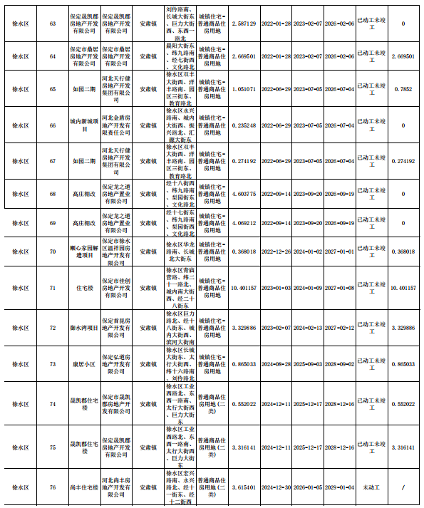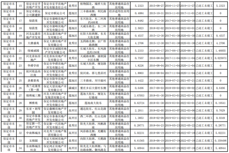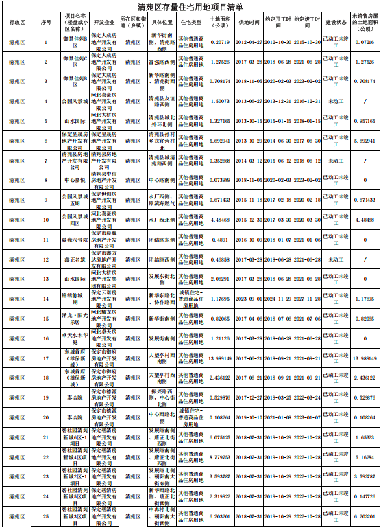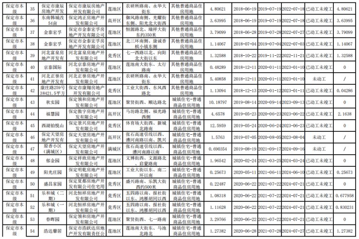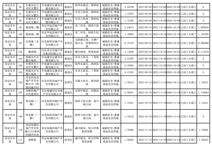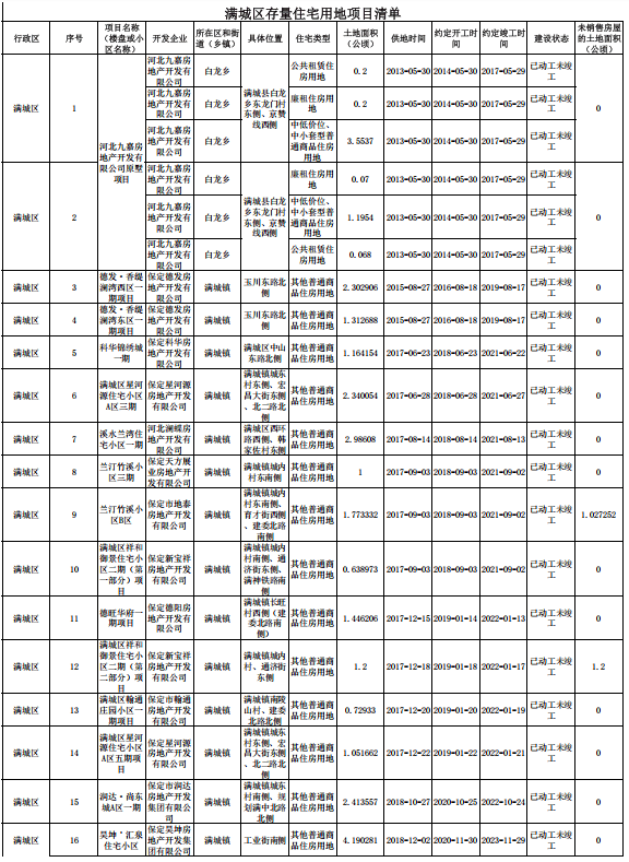 这份清单中,详细列明了目前在建及待建的住宅项目信息,包含所属区域、拿地时间、约定开工时间、竣工时间、未销售房屋的土地面积等,其中保定市本级202个存量住宅项目,满城区38个、清苑区 52个、徐水区 76个。