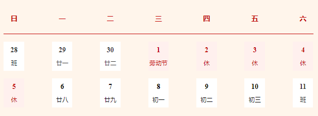 5月1日(星期三)至5月5日(星期日)放假,共5天,5月6日(星期一)上班。