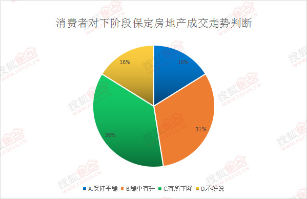 如图所示,31%的受访者认为保定房地产市场未来成交走势将稳中有升;36%的受访者认为保定楼市未来成交状况会有所下降;16%的受访者认为保定房地产未来成交走势将保持平稳;另有16%的受访者表示保定楼市未来成交走势不明朗。