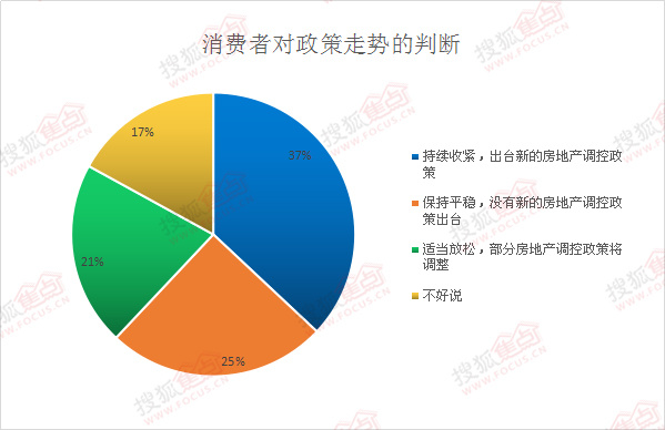 针对国家调控政策的调查,21%的受访者认为下阶段房地产政策会适当放松,部分房地产调控政策将调整;另有25%的受访者认为下阶段房地产政策会保持平稳,没有新的房地产调控政策出台;17%的受访者认为未来政策走势不太明朗;37%的受访者表示下阶段政策会持续收紧,出台新的房地产调控政策。