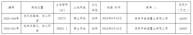 2025年9月19日,保定市公共资源交易中心公布国有建设用地使用权拍卖出让结果。公示显示,主城区两宗商业用地成功出让,均由保定市国资委旗下企业——保定市城鸿置业有限公司成功竞得。两宗地块成交总价分别为4.452亿元与3.48亿元,总计约7.93亿元。