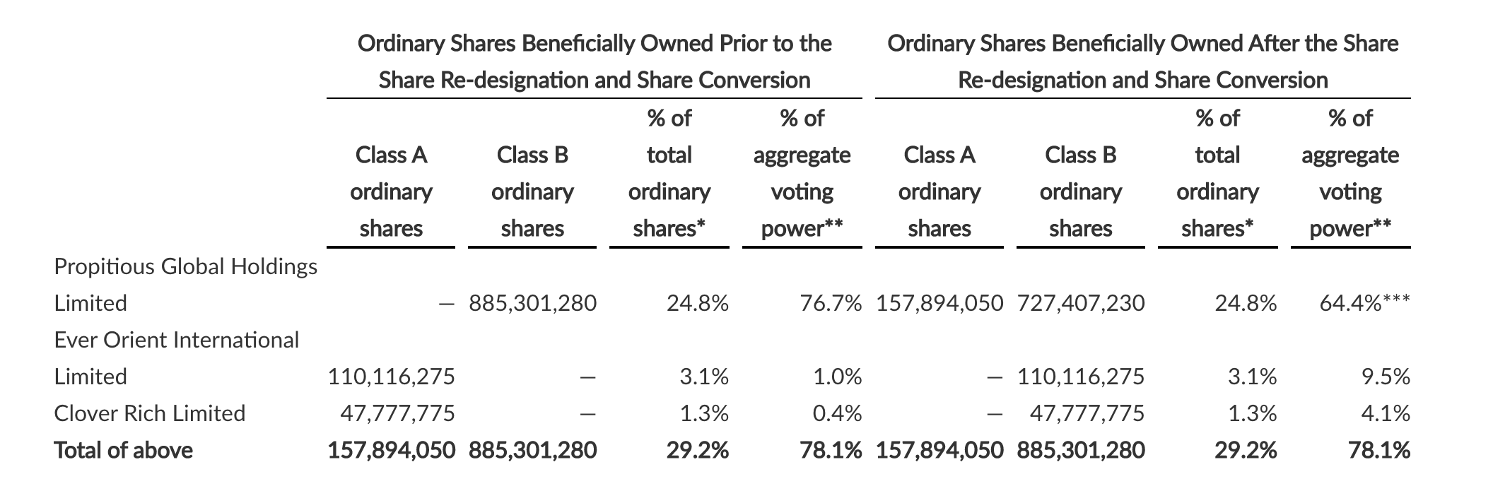 公告指出,待拟议的股权转换及股权再分配完成后,公司已发行及流通在外的B类普通股总数将维持不变,除Ever Orient International Limited、Clover Rich Limited及Propitious Global Holdings Limited外,股东的投票权不受影响。