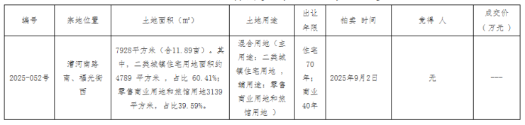2025年9月3日,保定市公共资源交易中心公布最新国有建设用地使用权拍卖出让结果公示。2025-052号地块为混合用地流拍,该宗地块位于位于漕河南路南、福光街西,总面积7928平方米,约11.89亩,容积率为2.8。