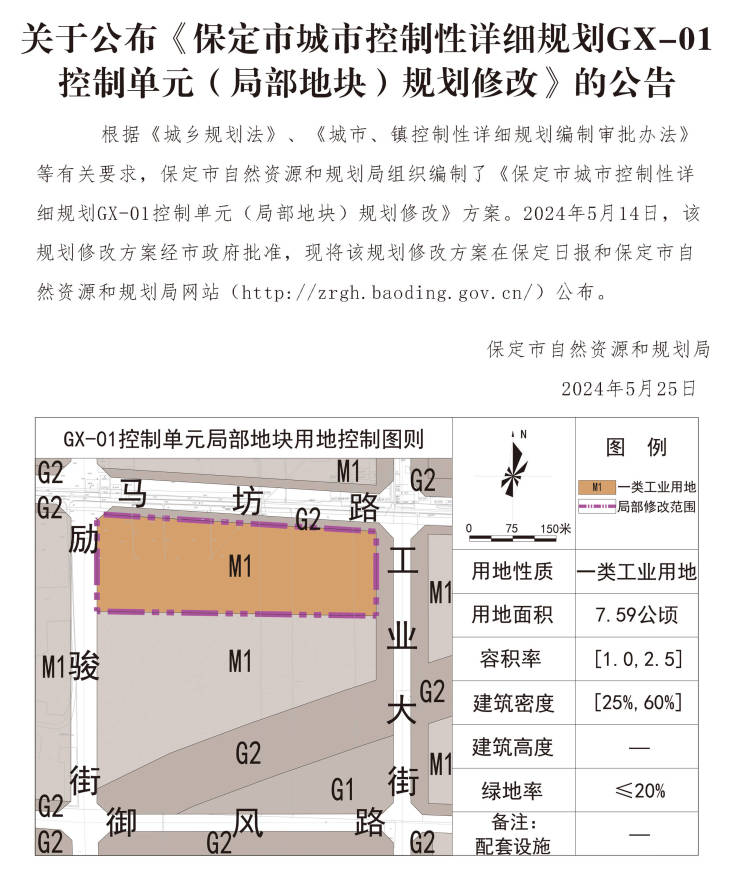 修规丨保定GX-01控制单元(局部地块)工业用地规划修改