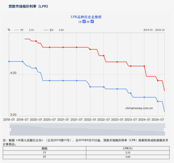 10月21日,中国人民银行授权全国银行间同业拆借中心公布,2024年10月21日贷款市场报价利率(LPR)为:1年期LPR为3.10%,5年期以上LPR为3.60%,均较前期下调25个基点。以上LPR在下一次发布LPR之前有效。