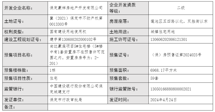 2024年4月24日,保定市行政审批局公布商品房预售许可证办理信息公示,尚达豪庭项目5#住宅楼商品房获预售,预售面积6968.17平方米,预售套数59套,预售证号 ;(保)房预售证第2024025号。