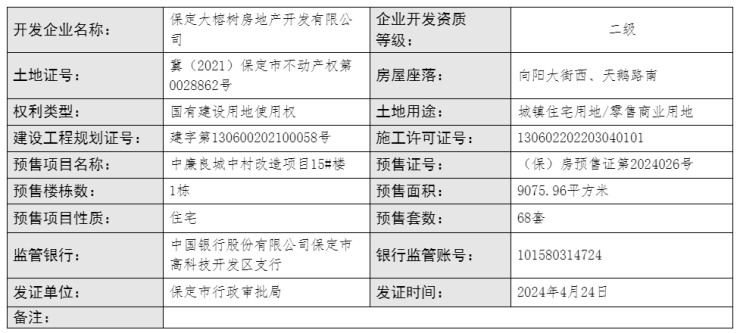 2024年4月24日,保定市行政审批局公布商品房预售许可证办理信息公示