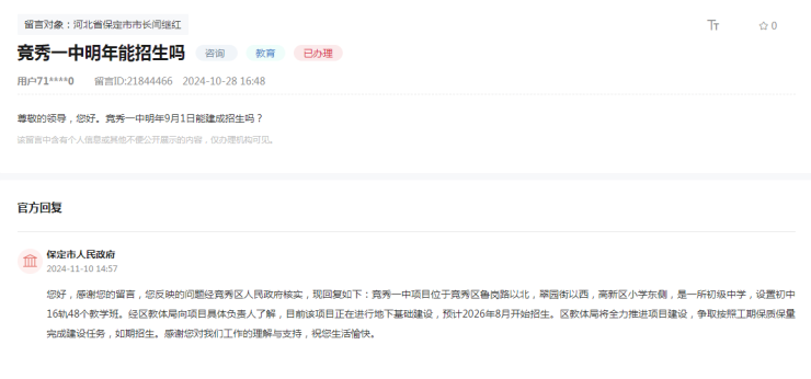 竞秀区人民政府回复市民咨询竞秀一中2025年9月招生。竞秀一中项目预计2026年8月开始招生,区教体局将全力推进项目建设。