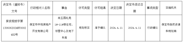 2024年4月15日,保定市自然资源与规划局发布保定市中悦房地产开发有限公司尚玉园礼苑1#-11#楼住宅、邻里中心及地下车库规划核实 。