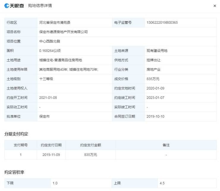 又于2019年9月23日以835万元竞得清2019-005地块,该地块位于清苑区中心西路北侧,面积为1682.64平方米,土地用途为居住用地和商服用地。