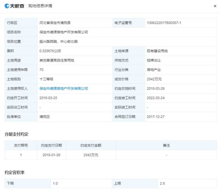 该公司曾于2017年12月22日,以2942万元竞得清土挂字【2017】第4号-04地块,该地块面积5298.76平方米,位于清苑区振兴路西侧、中心街北侧。