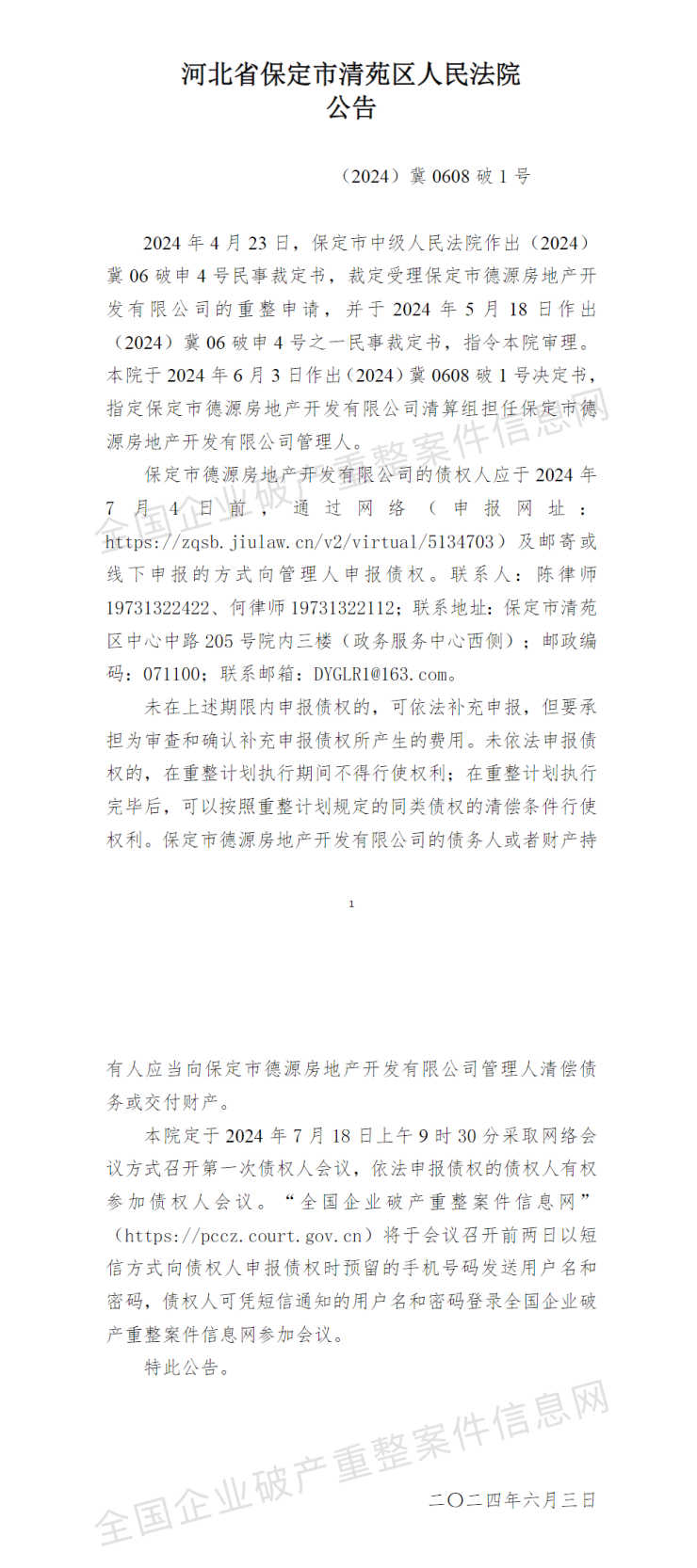 6月3日保定市清苑区人民法院作出(2024)冀0608破1号决定书,指定保定市德源房地产开发有限公司清算组担任保定市德源房地产开发有限公司管理人。