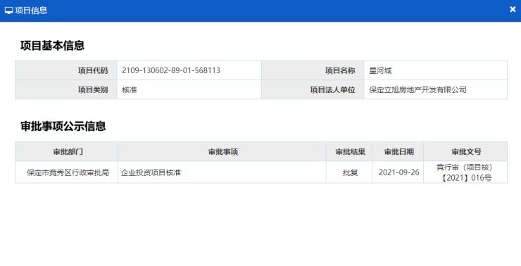 近日,搜狐焦点网由河北省投资项目在线审批监管平台获悉,保定市竞秀区行政审批局批复“星河城”企业投资项目核准,审批日期为2021年9月26日,项目法人单位为保定立旭房地产开发有限公司 。