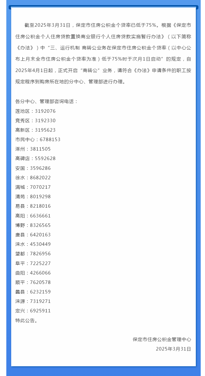 2025年4月1日起,保定市住房公积金管理中心启动“商转公”业务,个贷率低于75%的职工可到购房所在地的分中心、管理部办理。