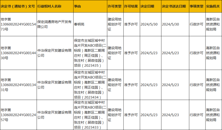 2024年6月5日,保定国家高新技术产业开发区管理委员会官网公布保定润通房地产开发有限公司春明苑、周庄村(周正佳园)、张庄村(居政佳园)项目建设用地批后公示。