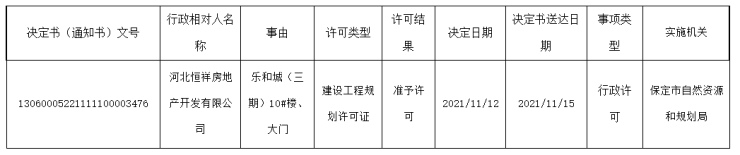 2021年11月17日,保定市自然资源和规划局公布了建设工程规划许可证下发情况,河北恒祥房地产开发有限公司乐和城(三期)10#楼、大门获证。