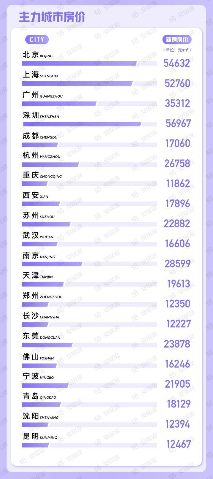 报告显示,5月全国重点监测的65城新房线上均价为17708元/平方米,环比微跌0.35%,其中有24城新房线上均价环比上涨。从主力城市的新房线上均价来看,一线城市中,深圳新房线上均价为56967元/平方米、北京为54632元/平方米、上海为52760元/平方米、广州为35312元/平方米。二线城市中,杭州新房线上均价为26758元/平方米、南京为28599元/平方米、天津为19613元/平方米、武汉为16606元/平方米、郑州为12350元/平方米、长沙为12227元/平方米。