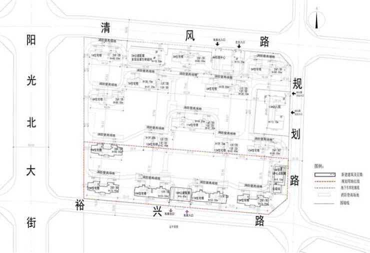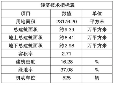 项目位于高新区阳光北大街东侧、裕兴路北侧,用地面积23176.20平方米(约34.76亩),规划用地性质为居住用地。规划条件为:容积率≥1.0、≤2.8,建筑密度≤20%,绿地率≥35%。总建筑面积约9.39万平方米,其中地上建筑面积约6.41万平方米,地下建筑面积约2.98万平方米,包括5栋住宅楼、1栋邻里中心及配套、1栋公建配套,其他控制指标均符合规划要求。