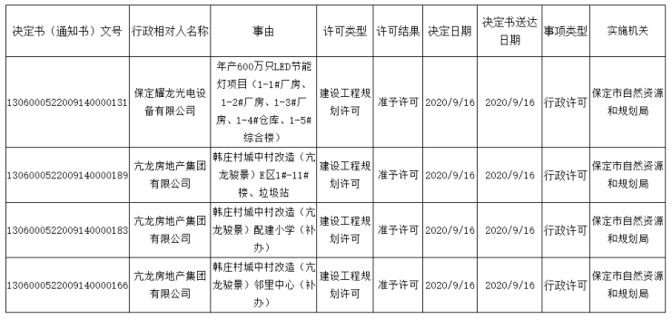 2020年9月16日,保定市自然资源和规划局公布了较新获发建设工程规划许可信息,公告显示亢龙骏景E区(韩庄村城中村改造项目)1#-11#楼、垃圾站;亢龙骏景配建小学、邻里中心(补办);保定耀龙光电设备有限公司年产600万只LED节能灯项目(1-1#厂房、1-2#厂房、1-3#厂房、1-4#仓库、1-5#综合楼)获建设工程规划许可证。