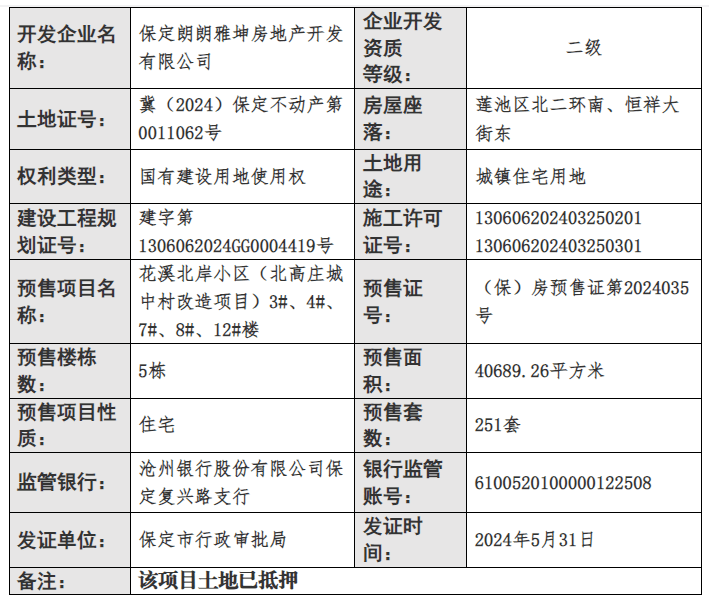 2024年5月31日,保定市行政审批局公布了一则商品房预售许可证下发公告,花溪北岸小区(北高庄城中村改造项目)3#、4#、7#、8#、12#楼商品房预售许可,共5栋楼楼。商品房预售证号为(保)房预售证第2024036号,预售面积40689.26平方米,预售套数251套。