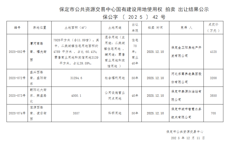 2025-073号地块位于朝阳北大街东、荣盛路北,面积4000.1平方米,规划为公用设施营业网点用地,由保定市泰源加油站有限公司竞得,成交价3850万元。