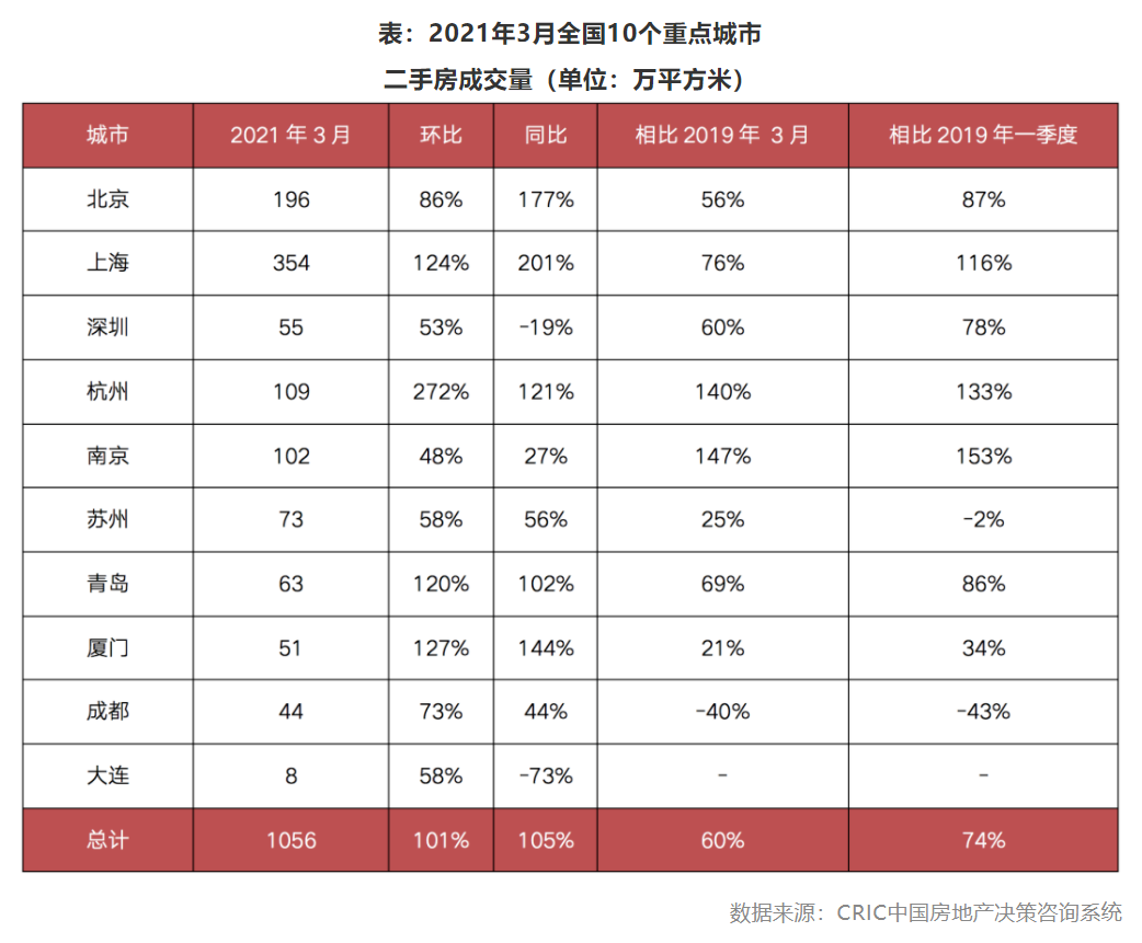 政策调控后,上海二手房成交规模并没有应声回落。据克而瑞数据,3月份上海二手房成交354万平方米,同比翻了2倍,较2019年同期也增76%。