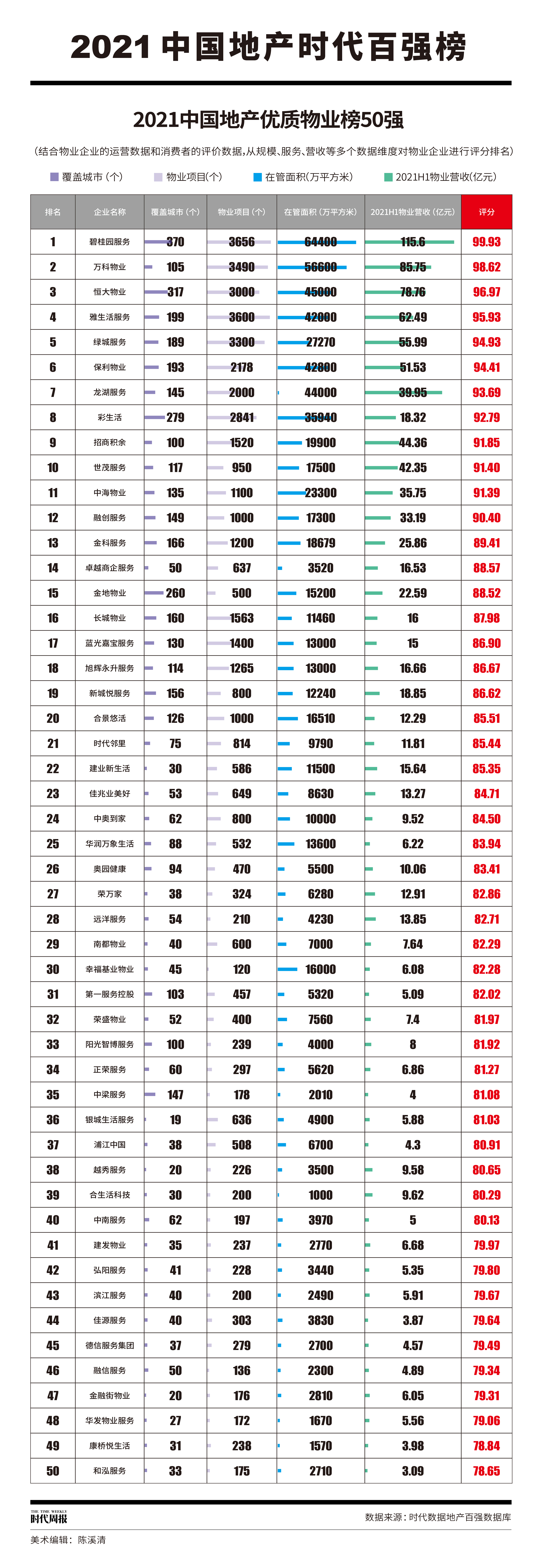 《榜单》依托时代传媒旗下的时代数据地产百强数据库,结合物业企业的运营数据和消费者的评价数据,从规模、服务、营收等多个数据维度对物业企业进行评分排名。