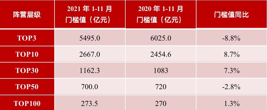 但1-11月各阵营门槛值开始出现回落。值得关注的是,TOP3房企门槛值为5495.0亿元,较上年下降8.8%;TOP50房企门槛值700.0亿元,较上年下降2.8%。此外TOP10房企门槛值为2667.0亿元,较上年增长8.7%;TOP30房企门槛值为1162.3亿元,较上年增长7.3%;TOP100房企门槛值为273.5亿元,同比微增1.3%。