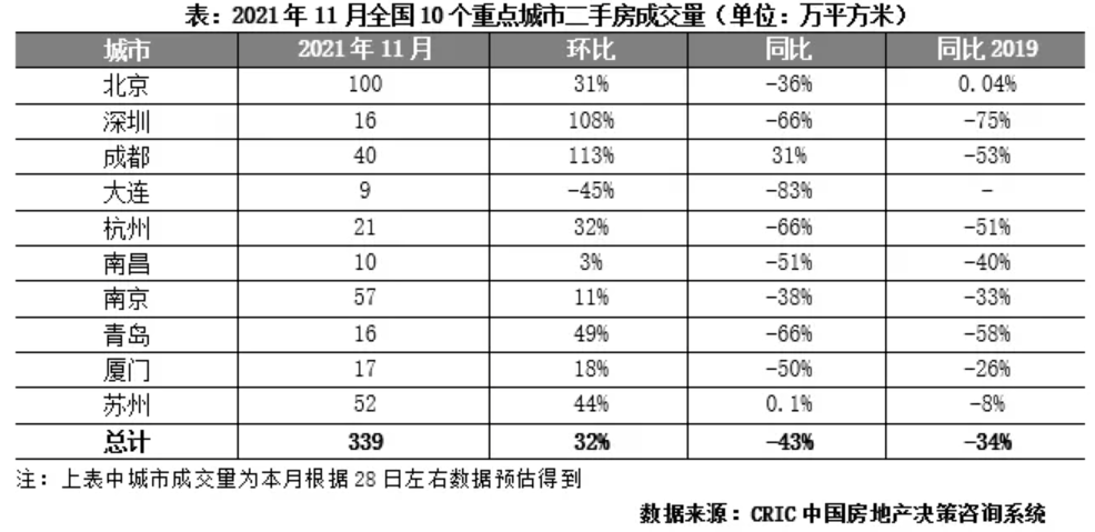 克尔瑞数据显示,11月份10个重点城市二手房市场共计成交面积339万平方米,整体规模环比回升32%,同比跌幅收窄至43%,相比2019年跌幅亦缩小至34%。