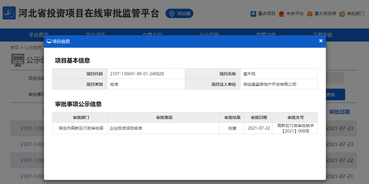 高新区项目“盛禾苑”企业投资项目核准批复,项目法人单位为保定盛玺房地产开发有限公司。