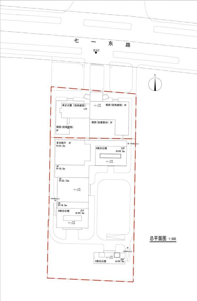 3、星座广场对裙房局部平面进行扩展优化,与卓正大厦裙房相衔接,同时结合功能需求优化局部房间层高,优化外立面;
