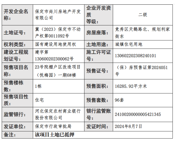 2024年8月7日,保定市行政审批局公布了两则商品房预售许可证下发信息,云曦境项目(23号院棚户区改造项目)一期6#、7#楼获发预售证,预售房源总套数172套.