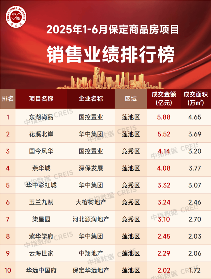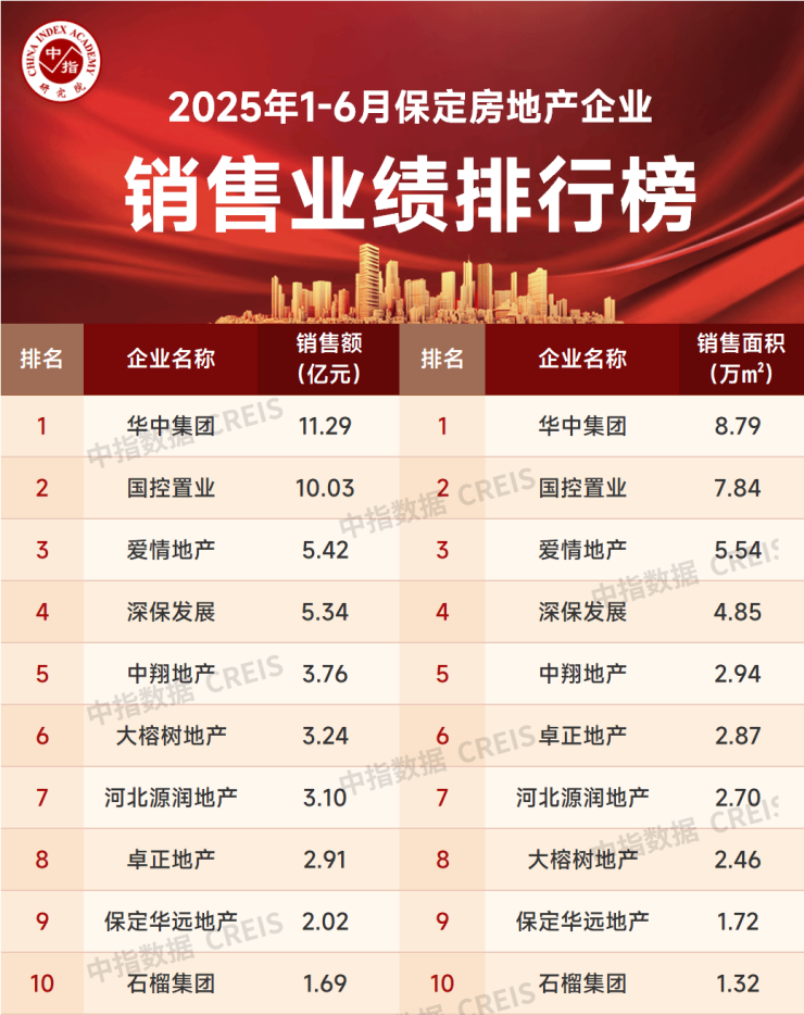 中指院丨2025年1-6月保定房地产企业销售业绩TOP10