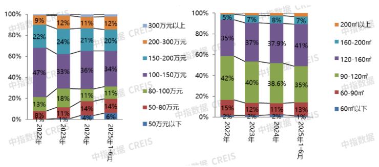 总价100-150万、面积段90-120平之间产品累计成交占比同比下滑较大。成交总价段来看,100-150万之间产品成交占比34%,较2024年减少2.5个百分点,但仍居首位;150-200万之间产品成交占比为20%,居第次席,较2024年减少1.2个百分点;200-300万之间产品成交占比为12%,较去年全年增加1.6个百分点;80万以下产品累计成交占比为20%,较去年全年占比增加2.4个百分点;成交面积段来看,120-160平之间产品成交占比为41%,居首位,较去年增加2.6个百分点;90-120平之间产品成交套数占比居次席,占比为35%,占比下滑3.7个百分点;60-90平之间产品成交占比约为13%,较去年全年占比增加1.5个百分点;160平以上产品成交占比约为11%,较去年全年占比增加约0.6个百分点。