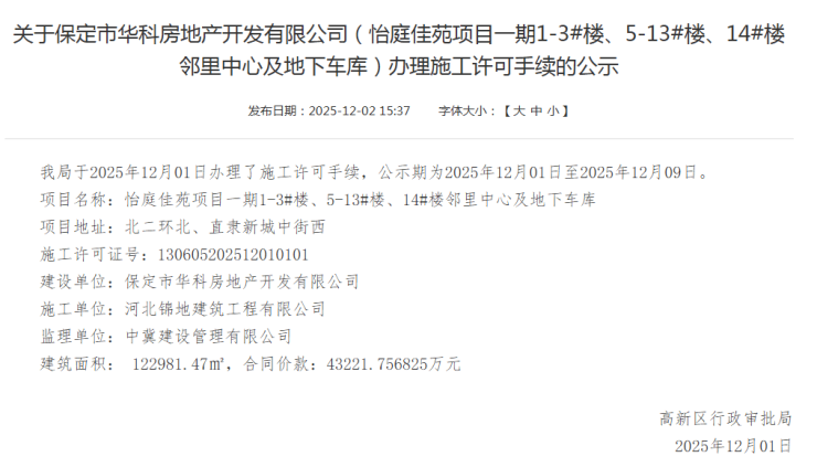 2025年12月1日,保定国家高新区行政审批局发布怡庭佳苑项目一期1-3#楼、5-13#楼、14#楼邻里中心及地下车库办理施工许可手续的公示。项目位于北二环北、直隶新城中街西。建设单位:保定市华科房地产开发有限公司,建筑面积122981.47㎡.