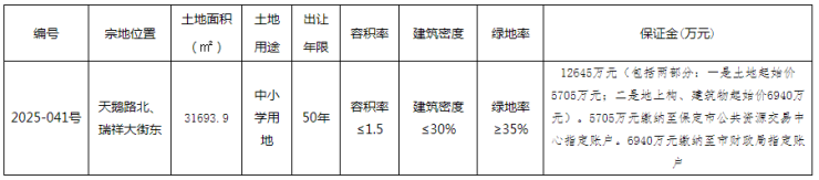 2025年5月21日,保定市公共资源交易中心发布国有建设用地使用权拍卖出让公告,主城区2025-041号中小学用地拍卖出让。该地块位于天鹅路北、瑞祥大街东,地块面积31693.9平方米,约47.54亩,土地用途为中小学用地,容积率≤1.5,产权为50年。