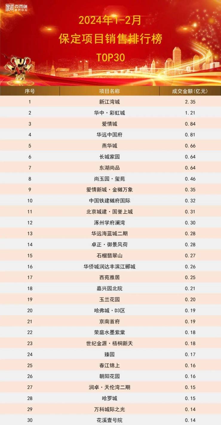 2024年1-2月,保定排行前30位在售项目的成交总金额为12.45亿元,成交总面积为13.09万㎡,成交总套数为1160套,成交均价9511元/㎡。