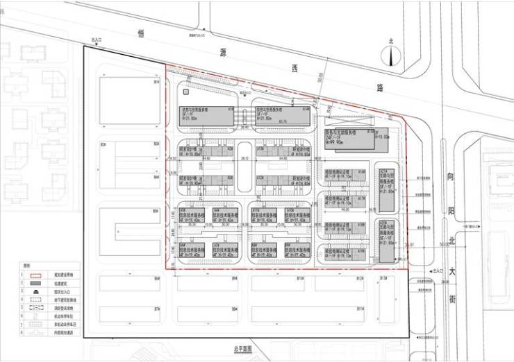 项目位于恒源西路南、向阳北大街西、旭阳路北,用地面积62695.90平方米(约合94.04亩),规划用地性质为工业用地(生产性服务业)。控规指标为:容积率≥1.3、≤3.5,建筑密度≥25%、≤50%,绿地率≥20%。总建筑面积约11.87万平方米,其中地上建筑面积约9.86万平方米,地下建筑面积约2.01万平方米。包括2栋信息与贸易服务楼、4栋研发设计楼、8栋信息技术服务楼、1栋商务与支助服务楼、4栋检验检测认证楼、2栋支助与贸易服务楼。其他控制指标均符合规划要求。