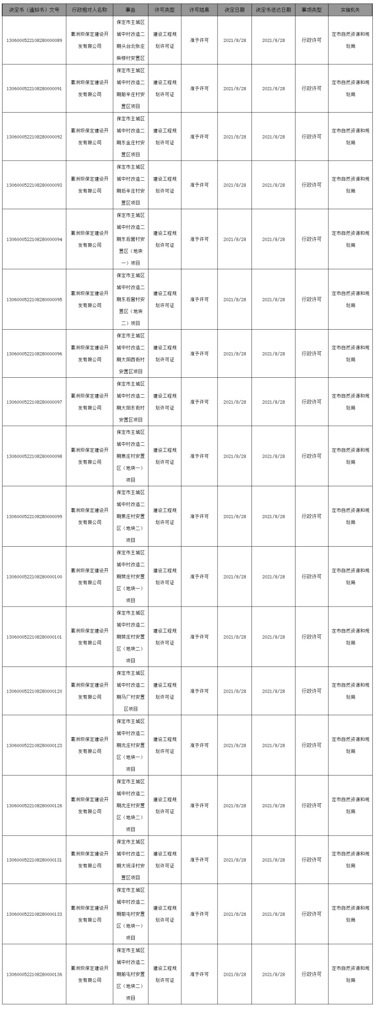 2021年9月1日,保定市自然资源和规划局公布了保定市主城区城中村改造二期18个项目安置区获得建设工程规划许可证情况。